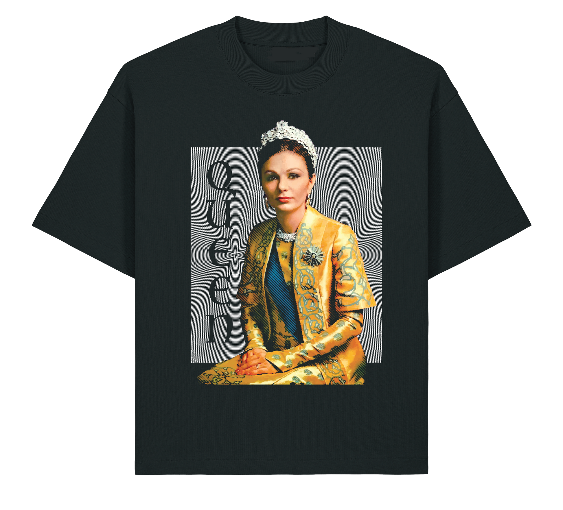 Our queen’s signature elegance shines through this halftone portrait, capturing her dignified poise and timeless style. Crafted with a premium, boxy, and oversized fit t-shirt, it’s a wearable tribute that blends her sophisticated legacy with a modern streetwear edge.